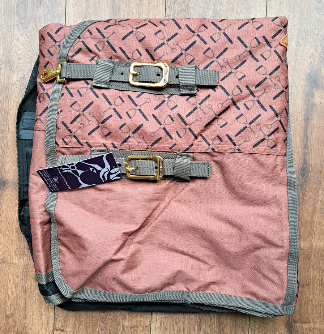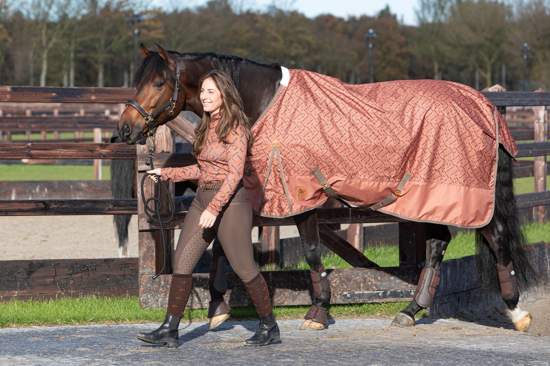Waterdichte en ademende outdoordeken met een fleece voering, naadloos op de rug en zonder vulling. Voorzien van een dubbele snelsluiting aan de voorzijde, staartflap, polyester voering op de borst tegen schuren, kruissingels, getapete naden en afneembare elastische bilkoorden.
