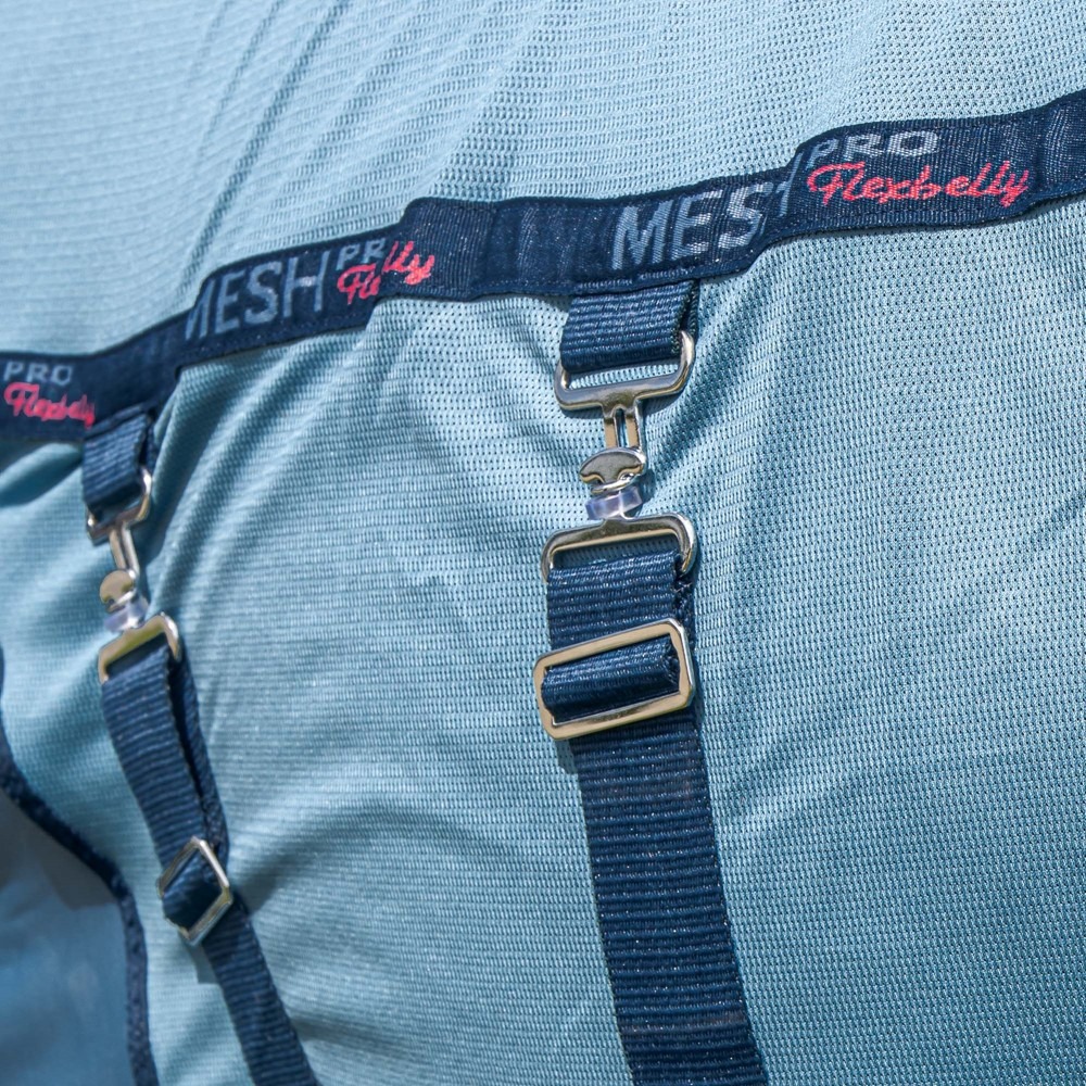 Mesh-pro deken te gebruiken als vliegendeken of cooler deken, voorzien van een dubbele voorsluiting, vaste hals met drie sluitingen en voering om de manen te beschermen, buiksingel, extra brede staartflap en staartlus, borst is polyester gevoerd.