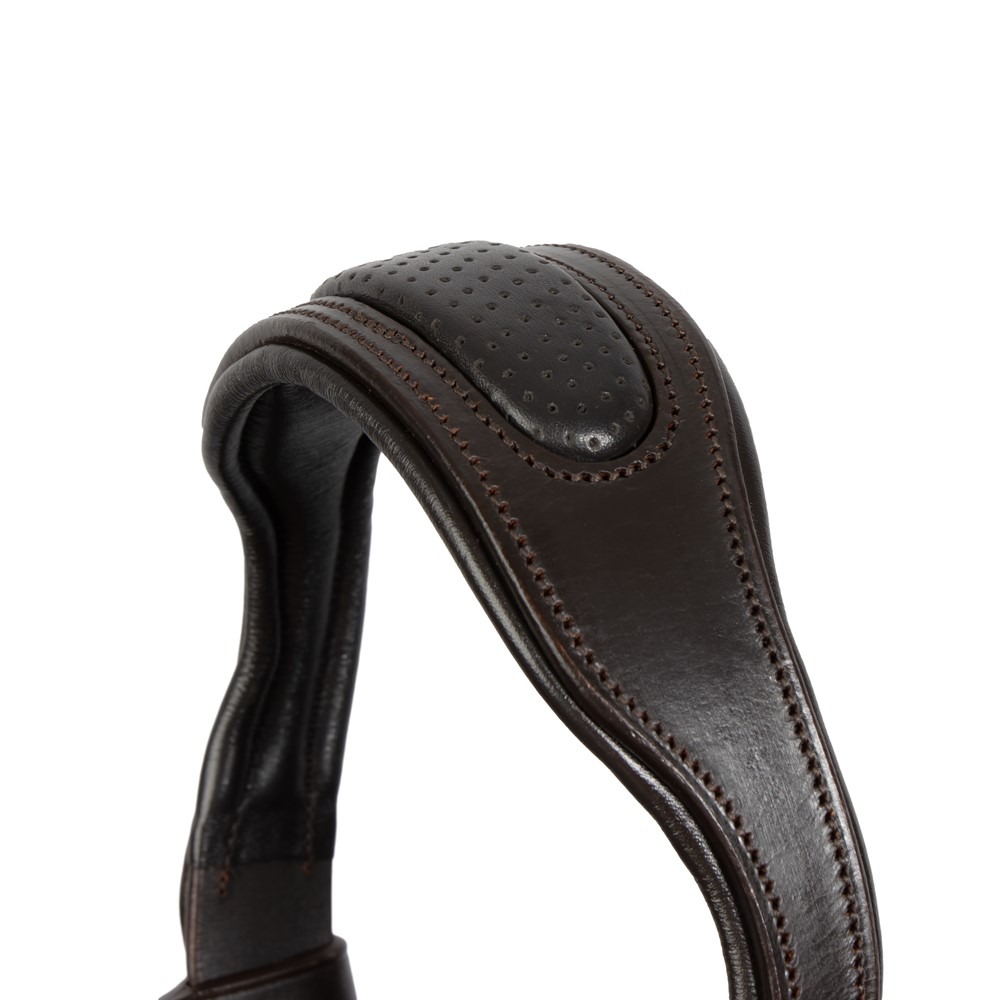 Lederen hoofdstel met anatomisch gevormd en zacht onderlegd kopstuk. Voorzien van een lakneusriem en koperkleurige sluitingen.