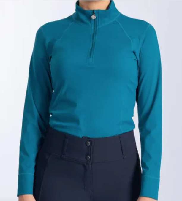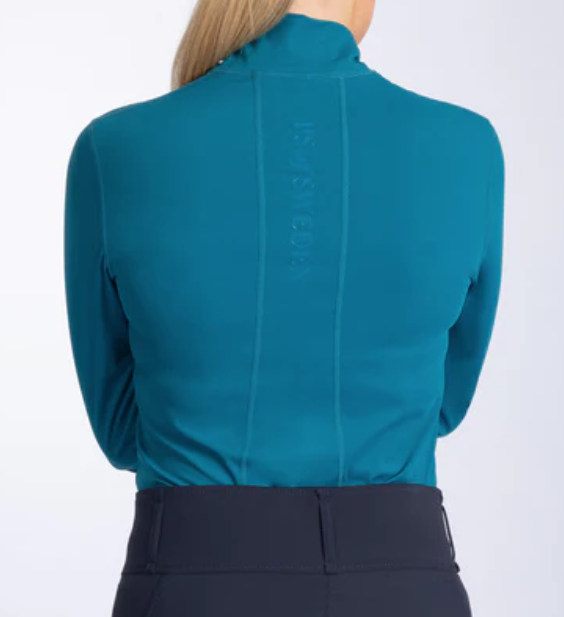 Basislaag met halve rits, gemaakt van een technische en luxueuze mix van gerecyclede polyamide. Details zoals een opstaande kraag, vormgevende naden en een tekstlogoprint op de rug geven de basislaag een stijlvolle en sportieve look.
