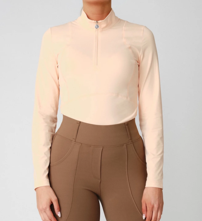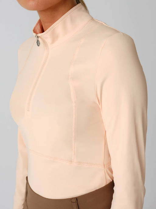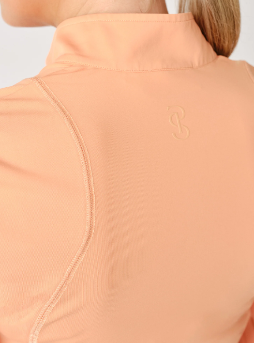Basielayer met lange mouwen en een halve rits, gemaakt van een luxe technische polyamide mix. De elegante en functionele kenmerken van het kledingstuk omvatten een hoge kraag, decoratieve naden, een ton-sur-ton monogramprint aan de achterkant van de nek en een rekbare stof.