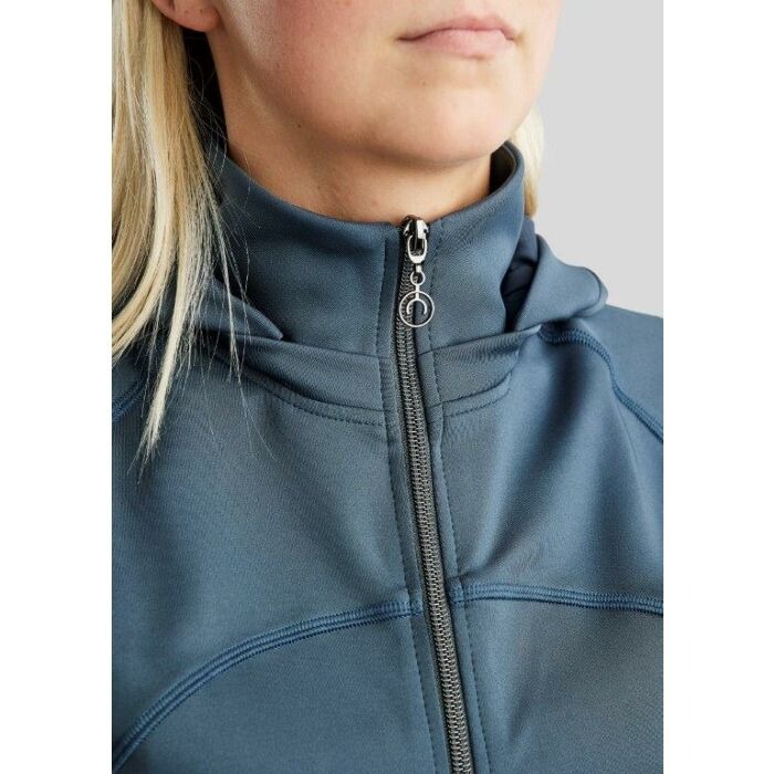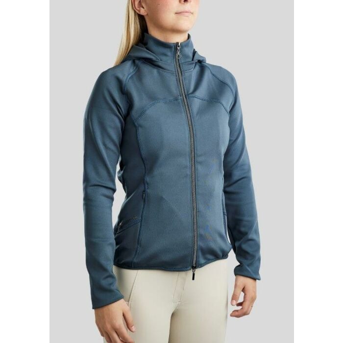 Het Montar MoBlair vest in de kleur Dark Slate is een sportief en functioneel vest dat perfect is voor zowel in als rondom de stal. Dit stijlvolle vest is ontworpen met oog voor detail en biedt een perfecte combinatie van comfort, bewegingsvrijheid en een moderne uitstraling. Het vest is gemaakt van een hoogwaardige technische stof die lichtgewicht is en zacht aanvoelt op de huid. Dankzij de goede ademende eigenschappen blijft het vest comfortabel, ook tijdens intensieve trainingen of op warmere dagen. De getailleerde pasvorm sluit mooi aan en zorgt voor een vrouwelijke uitstraling, terwijl de volledige rits aan de voorzijde en de praktische zakken met rits zorgen voor extra gebruiksgemak. De capuchon met subtiele Montar-logo’s geeft het vest een sportieve en luxe touch. De capuchon kan stijlvol over de rug gedragen worden, waarbij het Montar-logo zichtbaar wordt. De fijne details en kwalitatieve afwerking maken dit vest tot een echte musthave voor iedere ruiter. Het Montar MoBlair vest is ideaal om te dragen tijdens het rijden, maar ook perfect als casual outfit in en om de stal